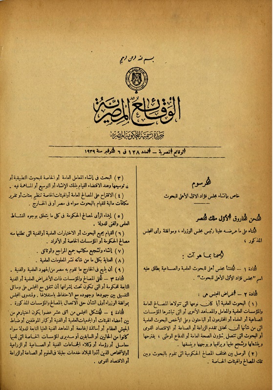 Egyptian Gazette, Issue No. 128, November 6, 1939, Royal Decree Establishing the King Fouad I National Research Centre