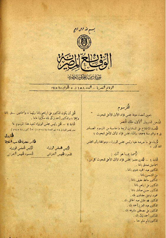 Egyptian Gazette, Issue No. 158, November 5, 1945, Royal Decree Appointing Members of the Board of the Fuad I National Research Council