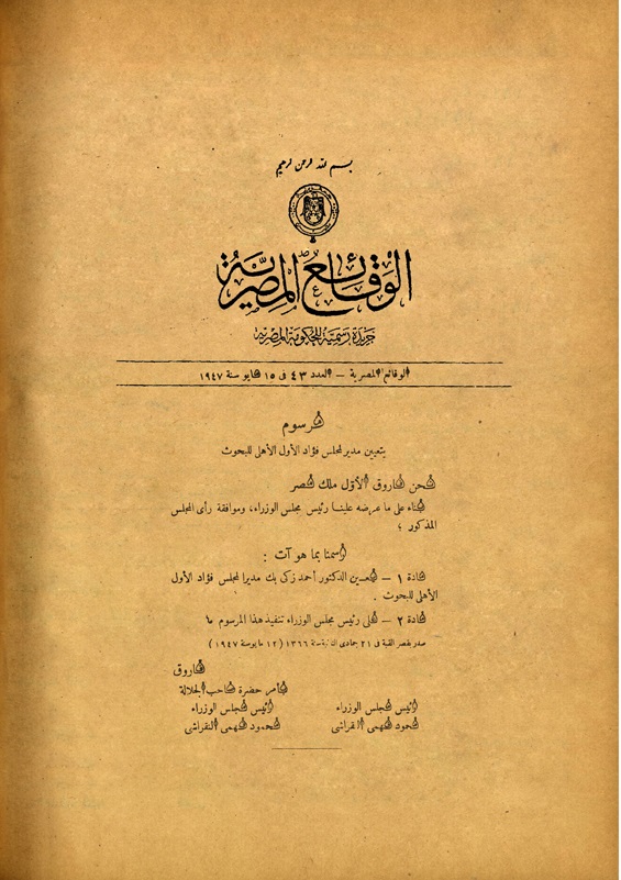 Egyptian Gazette, Issue 43, May 15, 1947: Royal Decree Appointing Dr. Ahmed Zaki Bey as Director of the Fuad I National Research Centre