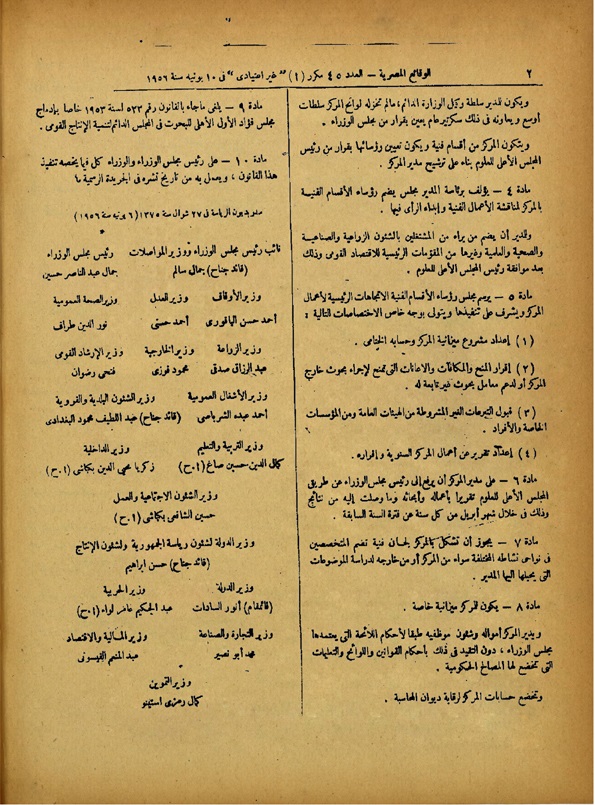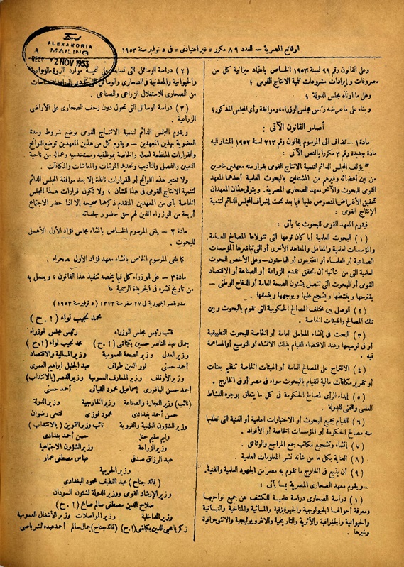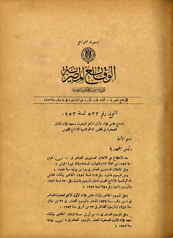 Egyptian Gazette, Issue 89, dated November 5, 1953. Presidential Decree merging the Fuad I National Research Council and the Fuad I Desert Institute into the Permanent Council for the Development of National Production.