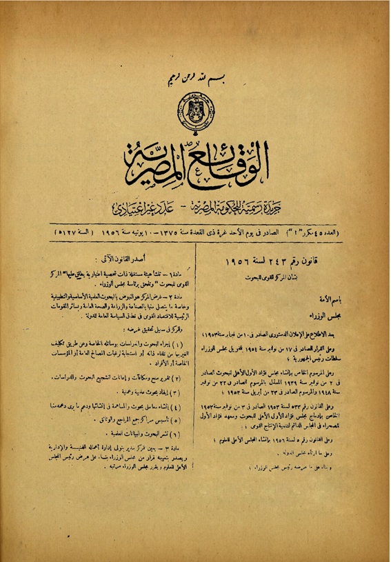 Egyptian Gazette, Issue No. 45, dated June 10, 1956, promulgating a law establishing an independent body with a legal personality called the "National Research Centre," attached to the Presidency of the Council of Ministers.